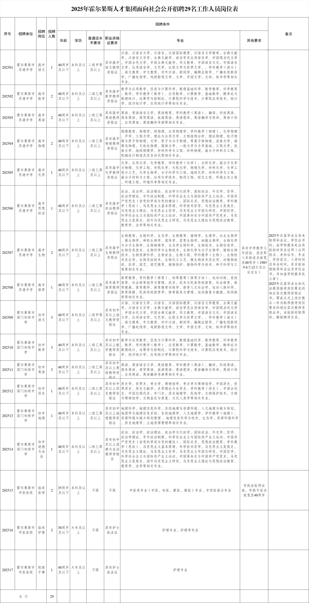 2025年6月21日发布的《2025年霍尔果斯人才集团面向社会公开招聘29名工作人员(教育系统24名、医疗系统5名)简章》,岗位表中部分岗位的“年龄”一栏条件放宽,将原公告中报考年龄上限放宽至40周岁(年龄计算时间截止至报名开始之日)。详见附件1岗位表,请各位报考人员仔细阅读岗位表,结合自身情况进行报名。