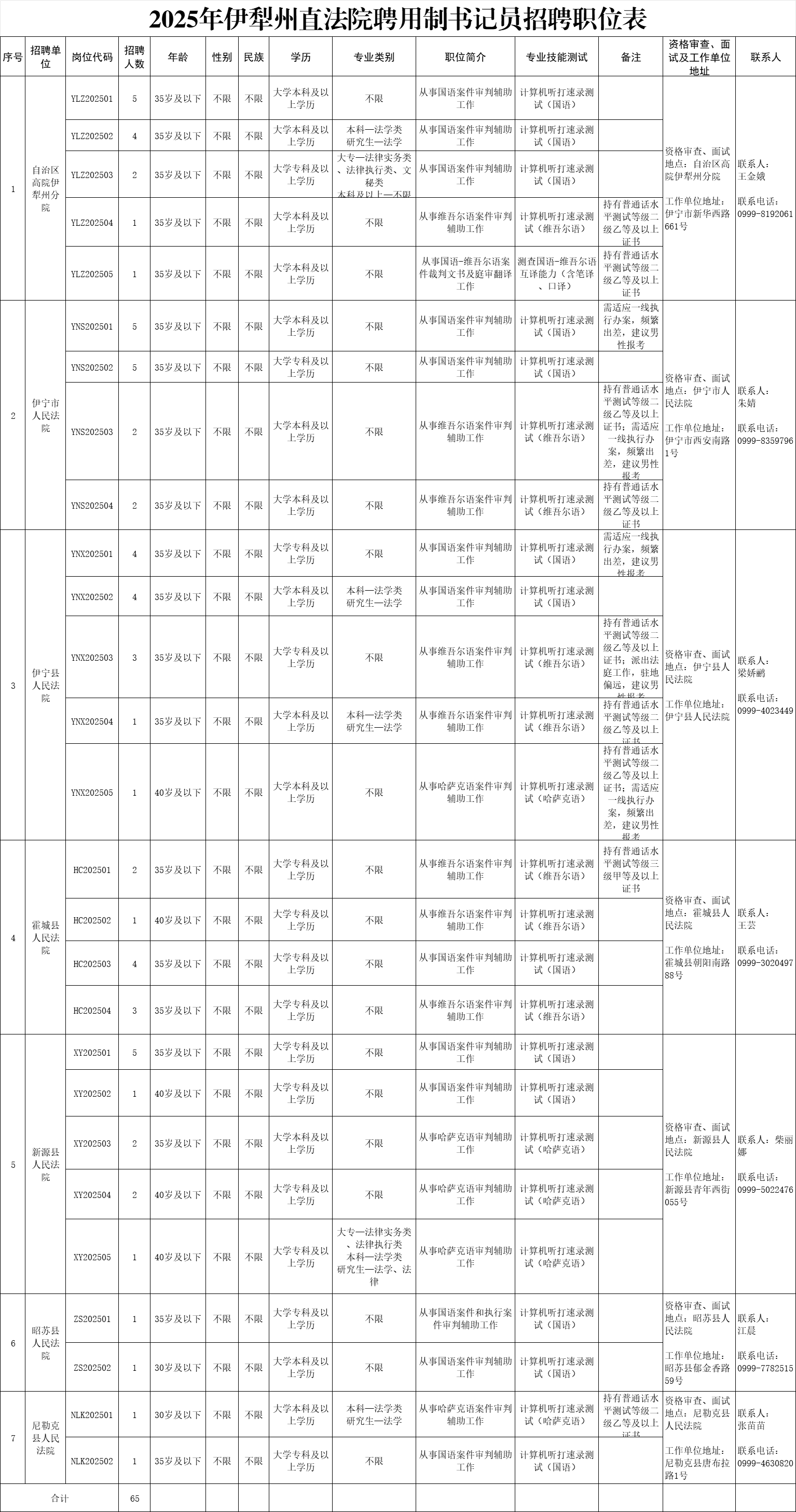 (一)招聘人数。共招聘聘用制书记员65名,具体岗位为:自治区高级人民法院伊犁州分院13名、伊宁市法院14名、伊宁县法院13名、霍城县法院10名、新源县法院11名、昭苏县法院2名、尼勒克县法院2名。详见《2025年伊犁州直法院机关聘用制书记员招聘职位表》(附件1)。